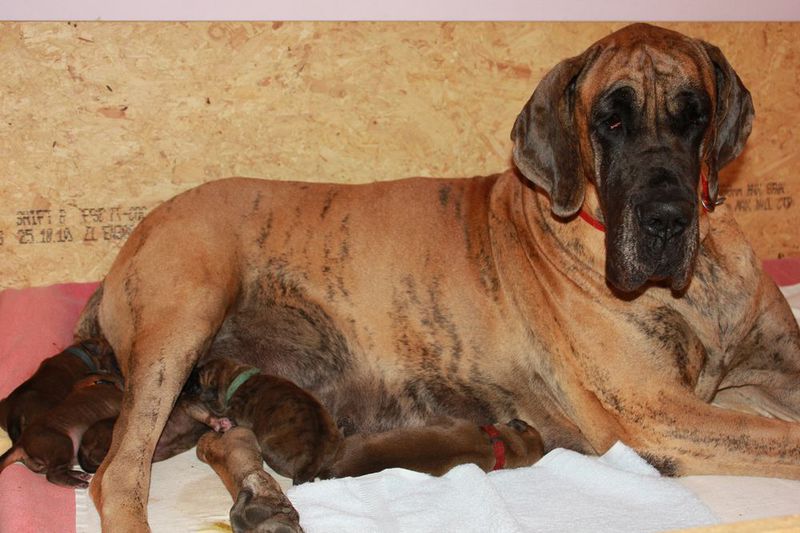 Damit hatte ja niemand gerechnet, das Venja als erstes die Babys bekommt. Fünf sind es an der Zahl, zwei gelbe Hündinnen und ein gelber Rüde mit zwei gestromten Rüden. Mama und die Kinder sind wohlauf. Venja ist wieder eine sehr liebevolle und ruhige ausgeglichene Mama. Ihre Milch ist gut und die Kinder nehmen täglich gut zu.