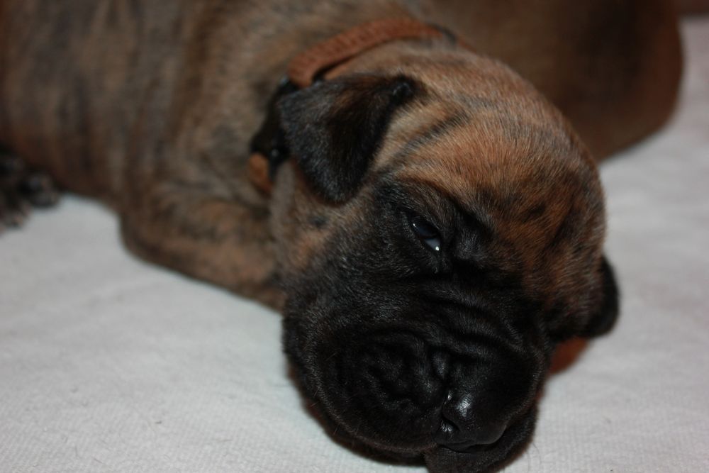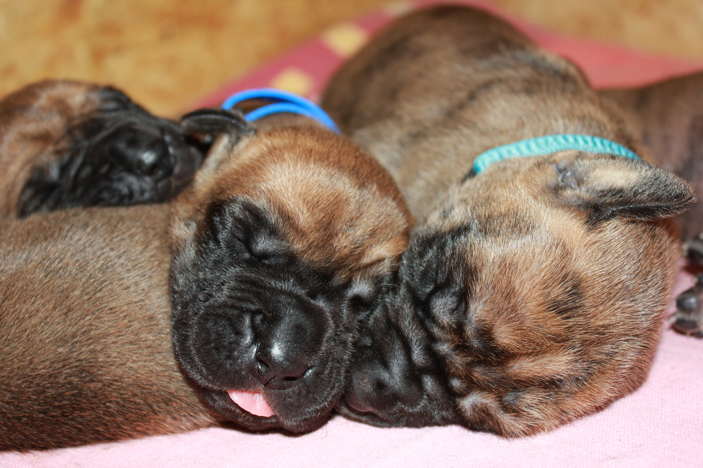 Ab heute lernen sich die Welpen kennen. Das Einzelkind Hokuspokus besucht die 5 gelb/ge-stromten Venjakinder. Im Film habe ich die ersten Schritte festgehalten, und auf den Fotos sieht man dann, wie aneinandergekuschelt sie gemeinsam geschlafen haben. Das hat allen gefallen! Heute sind die G Kinder drei Wochen alt geworden!