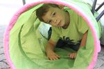Nun sind wir schon 5 Wochen alt und hatten eine aufregende Woche. Wir haben nun unser eigenes Spielzimmer, es ist komplett überdacht, knapp 80qm groß, und das Spielzeug ist spitze! Die Tunnel knistern so schön, wir sausen so durch zwei Tunnel und klettern auch schon auf das Gitterbett. Hokuspokus findet es mittlerweile ganz interessant mit den gelben und gestromten. Und Mama Sissi lässt auch alle an die Milchbar. Venja sondert sich schon ein wenig ab, und übergibt Sissi alle Kinder. Aufgaben wie spielen, erziehen und liebkosen. Gut das die sechs Welpen zwei Mamas haben.